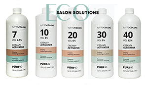 Hydrogen peroxide has two atoms of hydrogen and 2 atoms of oxygen. Its molecule is unstable (H2O2). The Tutto laboratory has succeeded in assembling raw materials to guarantee product stability. In fact, hydrogen peroxide (H2O2) tends to free an atom of oxygen to become a water molecule (H2O). This very active oxygen tends to combine with other substances. This chemical reaction is termed oxidation. Hydrogen peroxide is, consequently, the base of every permanent dye. Tutto have designed their Oxidizing Emulsions with reliable and predictable results when used with their hair color. The creamy conditioning base will keep hair soft and shiny. MIX EQUAL PARTS OF COLOR WITH OXIDIZING EMULSION